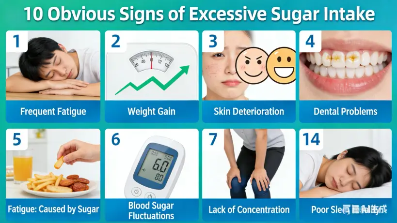 - 10. Poor Sleep Quality —— Difficulty falling asleep, easy waking up at night, or light sleep. This is because sugar affects the secretion of melatonin and disrupts the biological clock.