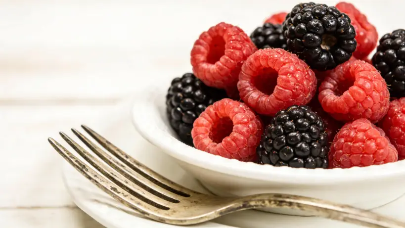 Raspberries have 8g of fiber per cup (32% of daily intake). Daily berries prevent constipation, reduce bloating, and lower risk of IBS and colon cancer.